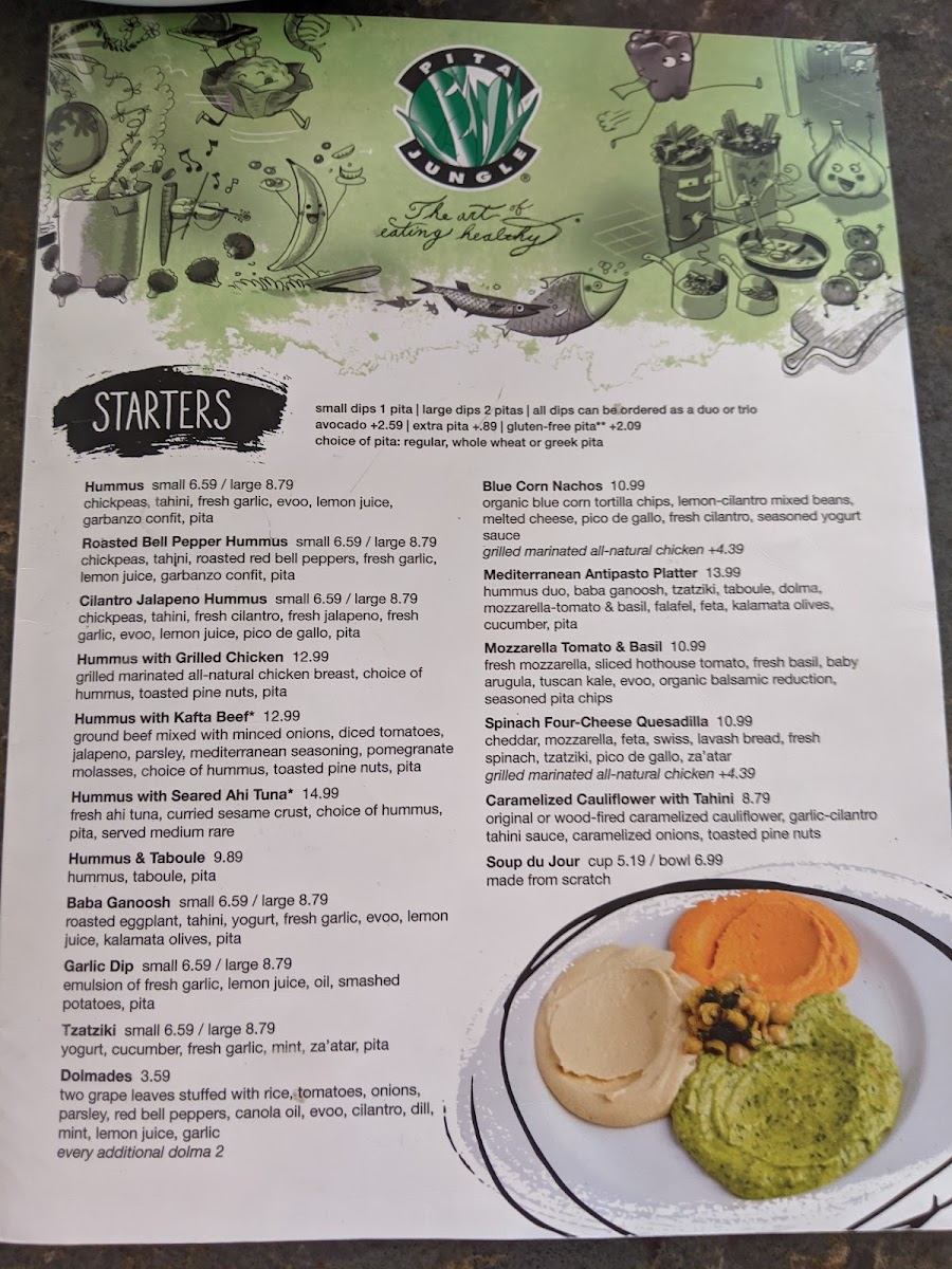 Pita Jungle, located at 9792 W Northern Ave, Peoria, offers a vibrant menu brimming with fresh, flavorful Mediterranean delights. Promising a welcoming atmosphere, it's a place where casual dining meets healthy eating. Start your culinary journey with their signature hummus varieties, including the spicy Cilantro Jalapeno Hummus and the unique Roasted Bell Pepper Hummus, perfect for sharing with warm pita.